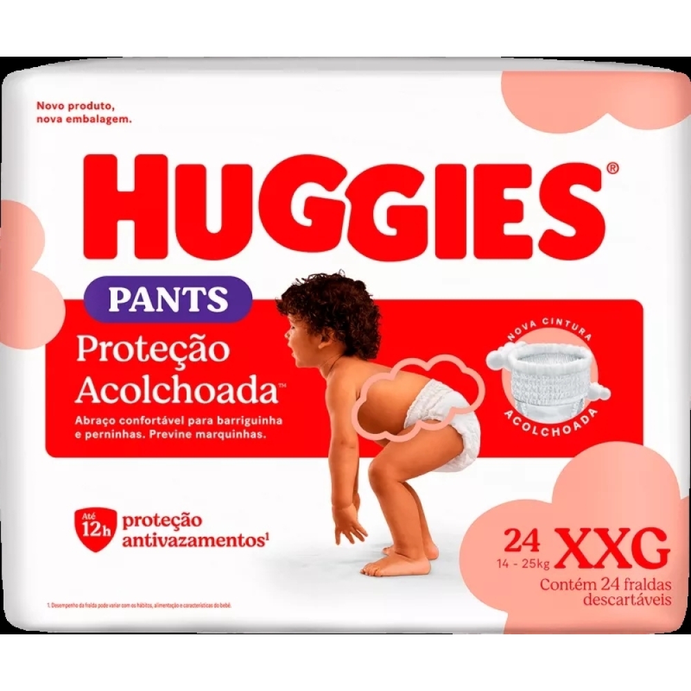 Descrição Fralda descartável Huggies Pants Proteção Acolchoada Mega até 12 horas de proteção, com formato tipo calçinha que facilita o vestir e proporciona mais conforto para o bebê. Desenvolvida com cintura elástica 360º e canais de absorção que distribuem melhor o líquido. PESO: 14 - 18 kg