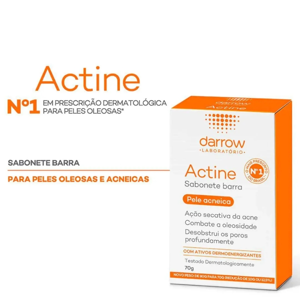 Descrição do produto O que é o Sabonete em Barra Actine Pele Acneica com 70g? O Sabonete em Barra Actine Pele Acneica é um produto de ação intensa que oferece maior controle para as peles oleosas e auxilia na redução da acne. Sua fórmula inovadora traz ação antisséptica e queratolítica, removendo a oleosidade excessiva da pele sem causar ressecamento.