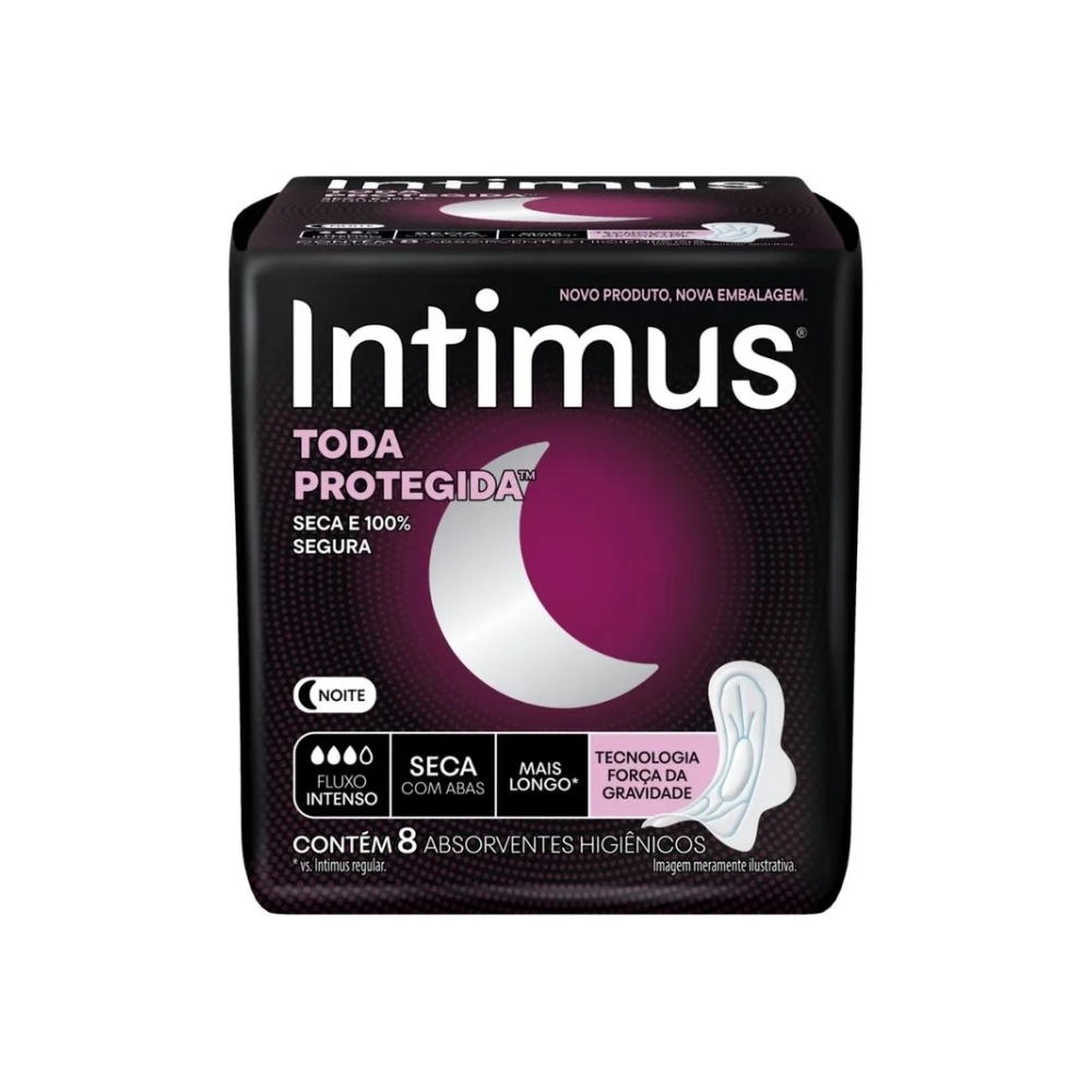 Descrição do produto O que é e para que serve o absorvente Intimus Noturno Toda Protegida Com Abas Cobertura Seca? O Absorvente Intimus Noturno Toda Protegida Com Abas Cobertura Seca é o seu aliado para uma noite tranquila e sem vazamentos. Trata-se de um absorvente externo com abas, com formato anatômico e mais longo (em comparação à versão regular do produto), ajudando você a ficar seca, confortável e protegida enquanto dorme.