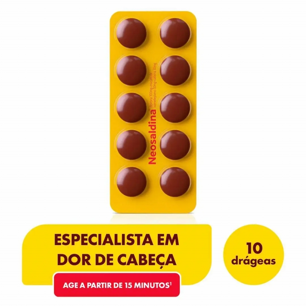 Advertências: -Não use Neosaldina se tiver alergia ou intolerância a qualquer componente da fórmula. -Não use durante crises de hipertensão arterial (pressão alta). -Não use em caso de alterações nas qualidades do sangue ou doenças metabólicas como porfiria ou deficiência congênita da glicose-6-fosfato-desidrogenase. -Não use doses mais altas ou por período prolongado sem recomendação médica. -Contraindicado para menores de 12 anos. -Não parta, abra ou mastigue as drágeas. -Não exceda 8 drágeas por dia (4 vezes ao dia, 1 a 2 drágeas por vez). -Em caso de persistência dos sintomas, consulte um médico ou cirurgião-dentista.