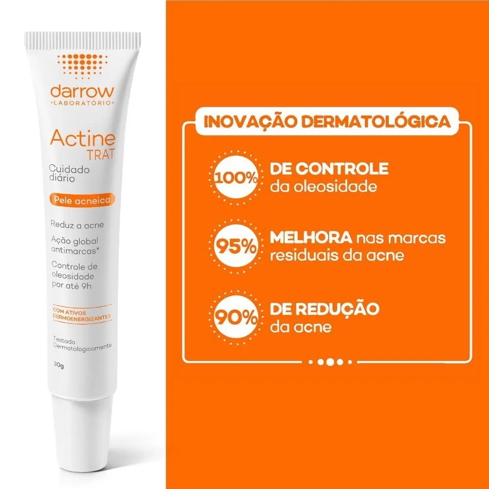 O Actine Trat Gel Antiacne (30g) da Darrow é um tratamento de uso diário formulado para peles oleosas e acneicas, apresentando textura em gel de rápida absorção e toque seco. Com ativos como ácido salicílico, zinco e clareadores, ele reduz lesões inflamadas (espinhas) e cravos, além de controlar a oleosidade por até 9 horas e disfarçar poros.