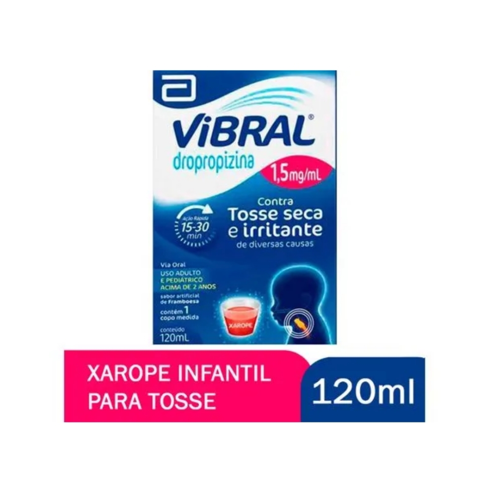 Vibral® é um medicamento contra tosse que age bloqueando os receptores da tosse. Apresenta uma discreta ação antialérgica, podendo ser usado no tratamento da tosse associada à condição alérgica. A dropropizina é rapidamente absorvida pelo trato gastrintestinal, com início de ação entre 15 a 30 minutos após a sua administração por via oral (por boca). Vibral® xarope adulto (3 mg/mL) Adultos e crianças maiores de 12 anos: 1 copo-medida (10 mL), 4 vezes ao dia. Vibral® xarope pediátrico (1,5 mg/mL) Crianças de 2 a 3 anos: ¼ a ½ copo-medida, 4 vezes ao dia. Crianças acima de 3 anos: 1 copo medida, 4 vezes ao dia. Siga corretamente o modo de usar. Em caso de dúvidas sobre este medicamento, procure orientação do farmacêutico. Não desaparecendo os sintomas, procure orientação de seu médico ou cirurgião-dentista.