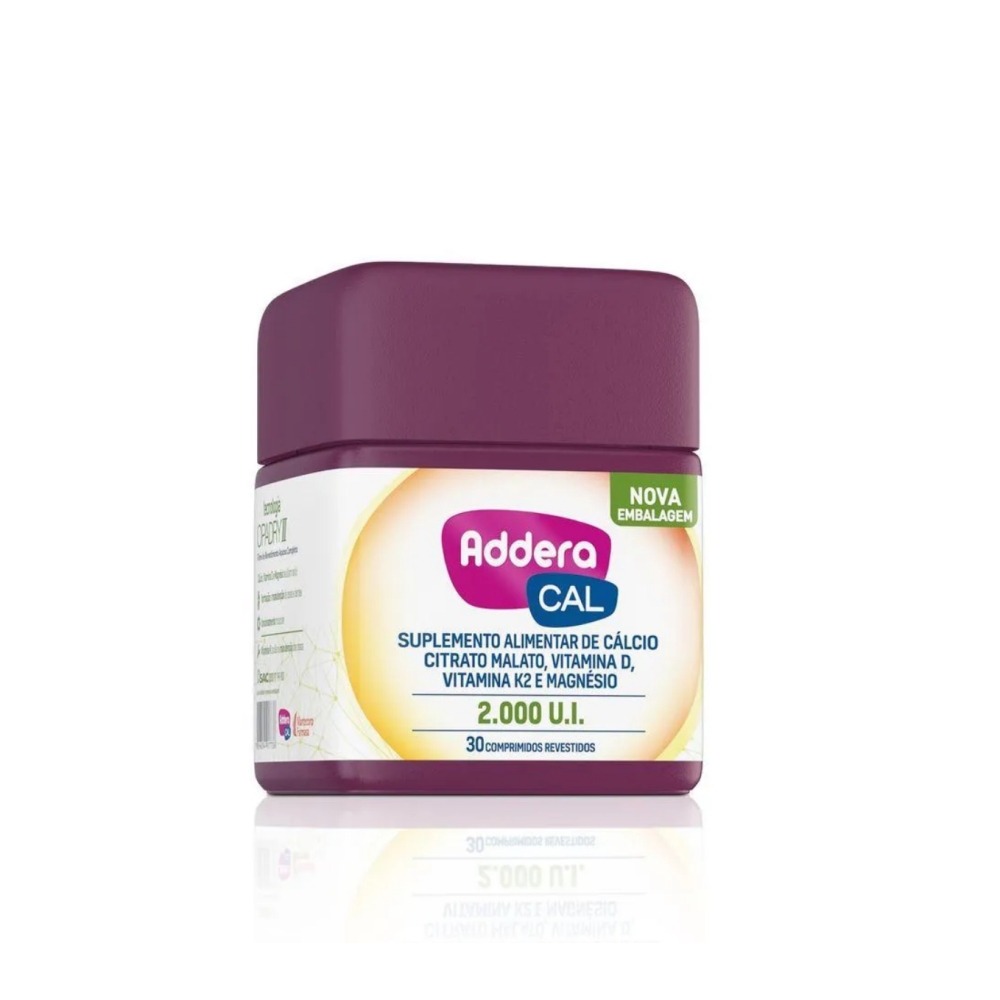 Addera CAL possui cálcio, vitamina D e magnésio que auxiliam na formação e manutenção de ossos e dentes e no funcionamento muscular.