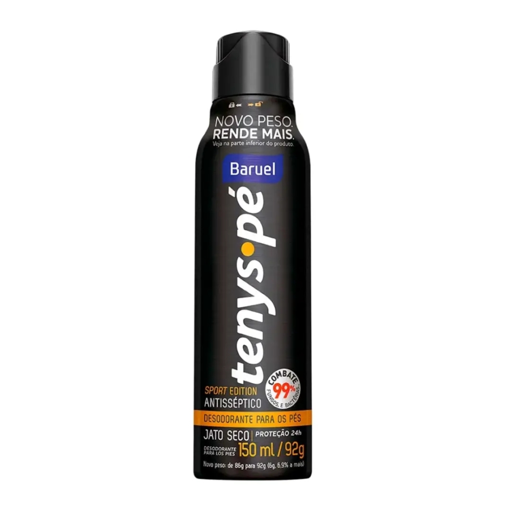 Benefícios e diferenciais do desodorante para os pés TenysPé Jato Seco Sport Edition -Tenys Pé spray jato seco. -Desodorante antisséptico para os pés. -Combate 99% de fungos e bactérias. -Secagem instantânea -Proteção por até 24h. -Protege contra os odores da transpiração. -Mantém os pés secos, protegidos e livres de odores. -Pode ser aplicado diretamente nos pés. -Não deixa resíduos visíveis. -Dermatologicamente testado.