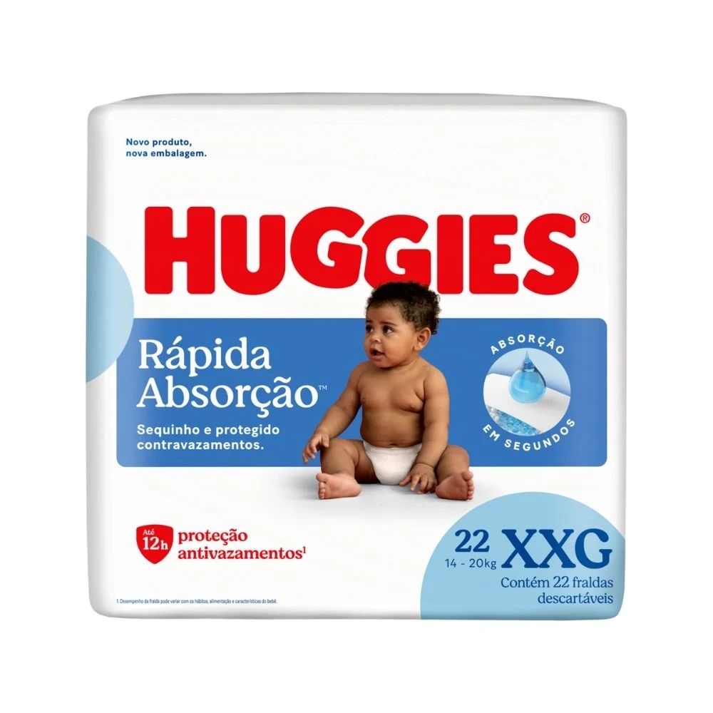 Este pacote contém: 22 fraldas Huggies Rápida Absorção XXG.