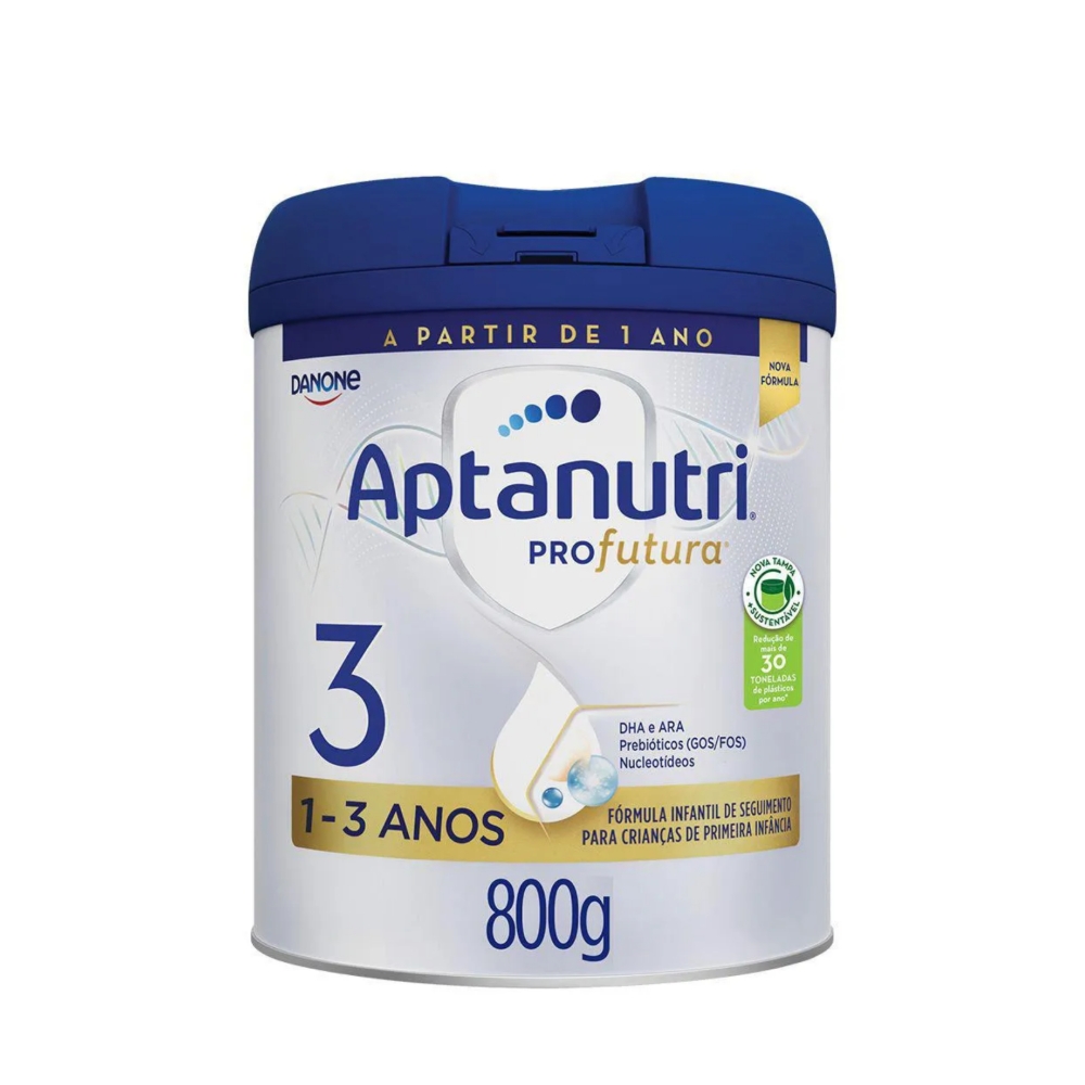 O Aptanutri Profutura 3 é uma fórmula infantil que contém nutrientes como ARA e DHA de duas vezes mais absorção, além de nucleotídeos, prebióticos exclusivos Danone e Vitaminas A, B12 e C.