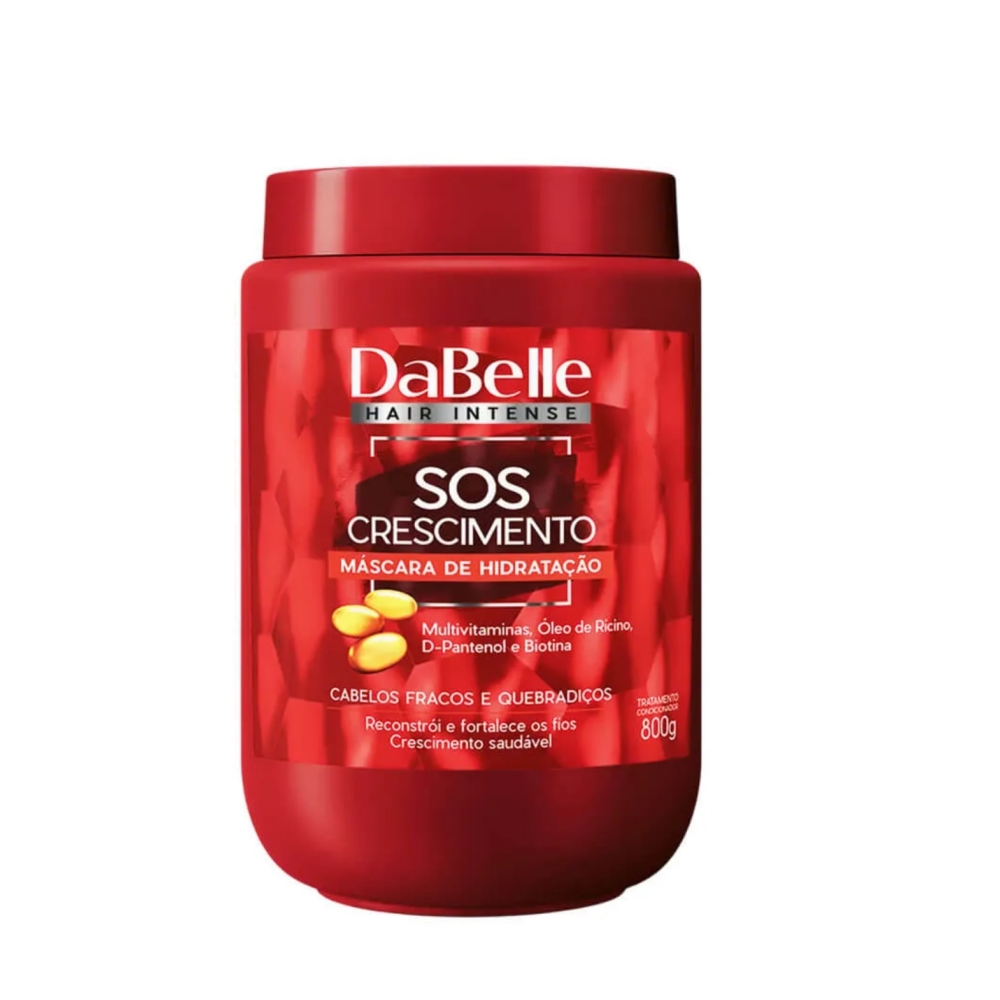 Máscara intensiva Dabelle SOS Crescimento que fortalece e estimula o crescimento dos fios. Fórmula concentrada com biotina, óleo de rícino e D-Pantenol que reduz a quebra, nutre profundamente e devolve maciez e brilho desde a primeira aplicação.