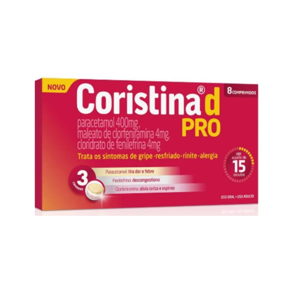 O Coristina D Pro é um medicamento indicado para o tratamento dos sintomas de gripe e resfriados. Sua fórmula atua no Sistema Nervoso Central para diminuir a febre e a sensibilidade à dor. Além disso, possui ação antialérgica que bloqueia a liberação de substâncias responsáveis por reações alérgicas, reduzindo o inchaço, a coriza e a rinite, o que promove o descongestionamento nasal. Seus princípios ativos combinados aliviam os principais desconfortos dos estados gripais, como febre e dor no corpo. O início de sua ação é rápido, ocorrendo em aproximadamente 15 minutos após a administração. Uso oral. Adultos (de 18 a 60 anos): tomar 1 comprimido a cada 4 horas. Limite máximo diário: não exceder 5 comprimidos ao dia. Duração do tratamento: utilizar enquanto os sintomas persistirem, respeitando o limite máximo de 3 dias, ou conforme orientação médica. Este medicamento não deve ser partido, aberto ou mastigado.
