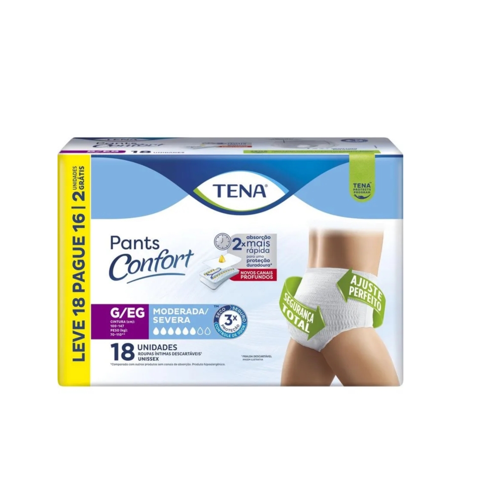 Roupa Íntima Descartável TENA Pants Confort é uma roupa íntima descartável e unissex de rápida absorção, proporcionando ao usuário ativo ou com pouca mobilidade facilidade de uso, discrição e segurança.