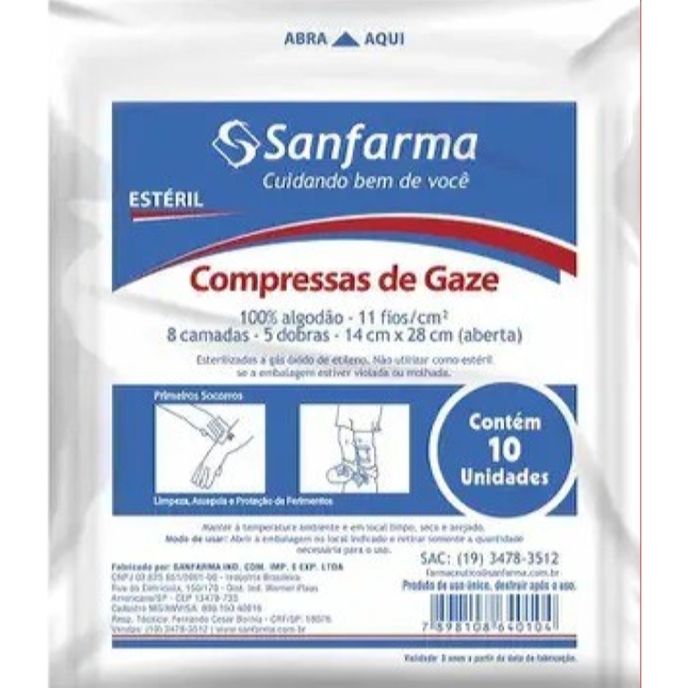Compressa de Gaze Sanfarma Estéril 11 fios 7,5cm x 7,5cm 10 Unidades É UM MEDICAMENTO. SEU USO PODE TRAZER RISCOS. PROCURE O MÉDICO E O FARMACÊUTICO. LEIA A BULA. SE PERSISTIREM OS SINTOMAS, O MÉDICO DEVERÁ SER CONSULTADO.