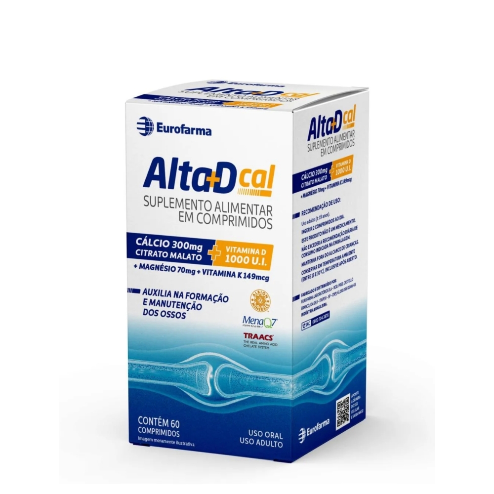 Alta D Cal é um suplemento alimentar criado para auxiliar na formação e manutenção dos ossos e dentes. Sua fonte de cálcio, o Citrato Malato de Cálcio, em conjunto com as vitamina d, K2 MenaQ7 e o Magnésio Bisglicinato Quelato atuam em conjunto para o máximo aproveitamento do organismo.