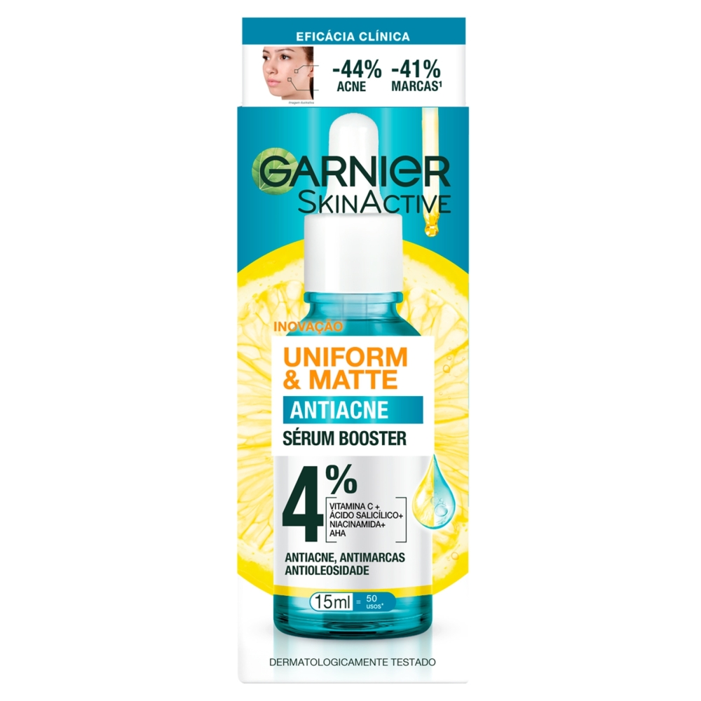 Descrição do produto O que é e para que serve o Sérum Facial Garnier Uniform & Matte Antiacne? O Garnier Uniform & Matte Antiacne é um sérum booster, de textura não oleosa, formulado com 4% de concentração de vitamina c + Ácido Salicílico + Niacinamida + AHA.