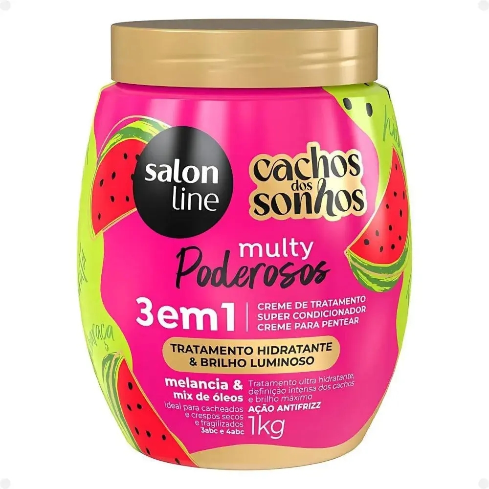Descrição do produto O que é e para que serve o Creme De Tratamento 3 Em 1 Salon Line Multy Poderosos Cachos Dos Sonhos Melancia E Mix De Óleos 1Kg? O Creme de Tratamento 3 em 1 é um produto multifuncional para cabelos cacheados e crespos, que atua como tratamento, condicionador e creme para pentear. Formulado com óleo de melancia, mix de óleos, glicerina vegetal e provitamina B5, o produto oferece hidratação profunda, nutrição e definição intensa para os fios.
