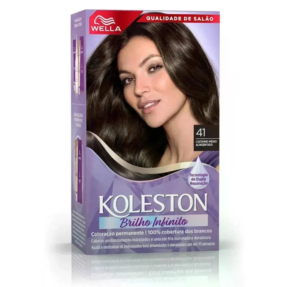 Descrição do produto O que é e para que serve a Tintura Creme Koleston Nº41 Castanho Medio Acinzentado 1 Unidade? A Tintura Creme Koleston é um produto capilar com fórmula exclusiva de Tratamento Gloss Intenso, que funciona como uma barreira de proteção nos cabelos, proporcionando mais brilho e maciez, além de manter a intensidade da cor. Serve para colorir os cabelos, cobrindo perfeitamente os fios brancos de forma rápida e fácil, com aplicação que dura apenas 20 minutos, podendo ser realizada em casa ou no salão de beleza.
