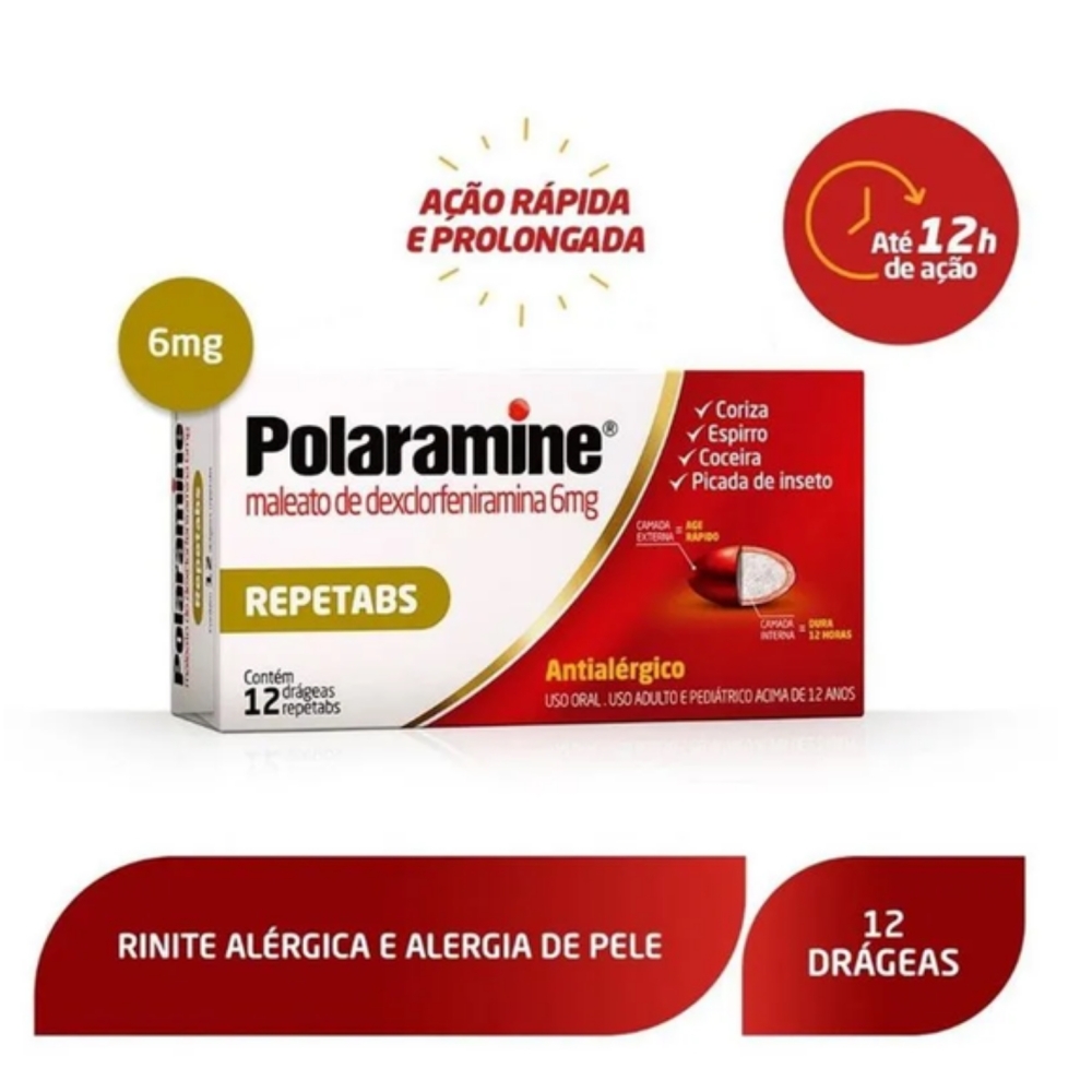 Polaramine repetabs 12 cpr É UM MEDICAMENTO. SEU USO PODE TRAZER RISCOS. PROCURE O MÉDICO E O FARMACÊUTICO. LEIA A BULA. SE PERSISTIREM OS SINTOMAS, O MÉDICO DEVERÁ SER CONSULTADO.