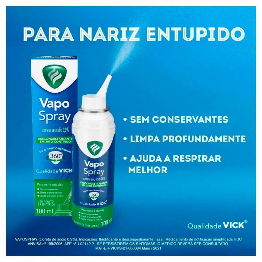 Vick 0.9% spray 100ml É UM MEDICAMENTO. SEU USO PODE TRAZER RISCOS. PROCURE O MÉDICO E O FARMACÊUTICO. LEIA A BULA. SE PERSISTIREM OS SINTOMAS, O MÉDICO DEVERÁ SER CONSULTADO.