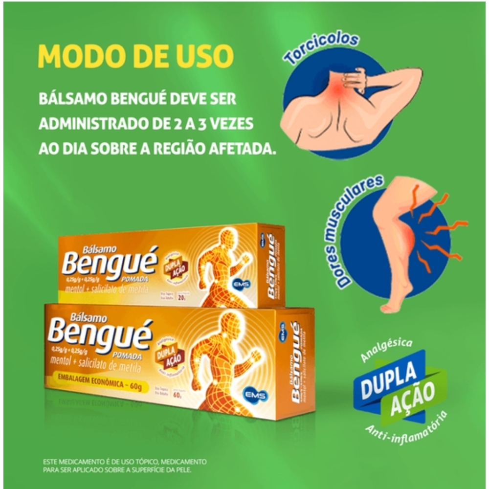 Bálsamo Bengué Xtra Pomada 60g É UM MEDICAMENTO. SEU USO PODE TRAZER RISCOS. PROCURE O MÉDICO E O FARMACÊUTICO. LEIA A BULA. SE PERSISTIREM OS SINTOMAS, O MÉDICO DEVERÁ SER CONSULTADO.