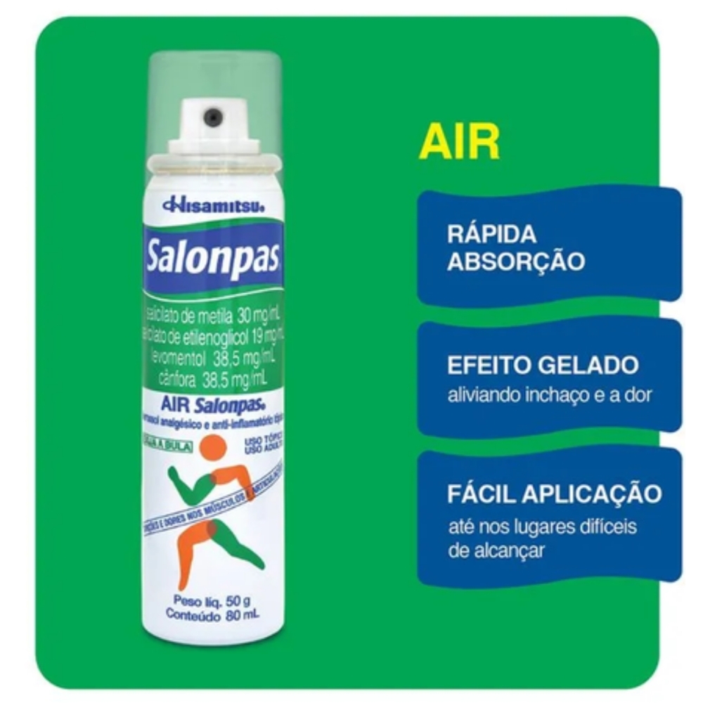 Descrição do produto Para que serve o Air Salonpas? Este medicamento é indicado para alívio de dores e inflamações nas seguintes condições: fadiga muscular, dores musculares e lombares, rigidez nos ombros, contusões, pancadas, torções, entorses, torcicolo, dores nas costas, nevralgia e dores articulares.