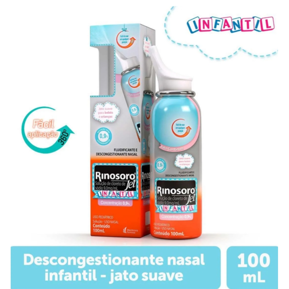 Descrição do produto O que é o Rinosoro Jet infantil 9mg/ml Descongestionante Nasal? Rinosoro Jet é uma solução estéril, sem conservantes, que age fluidificando a secreção nasal, favorecendo a eliminação do muco e descongestionando o nariz.