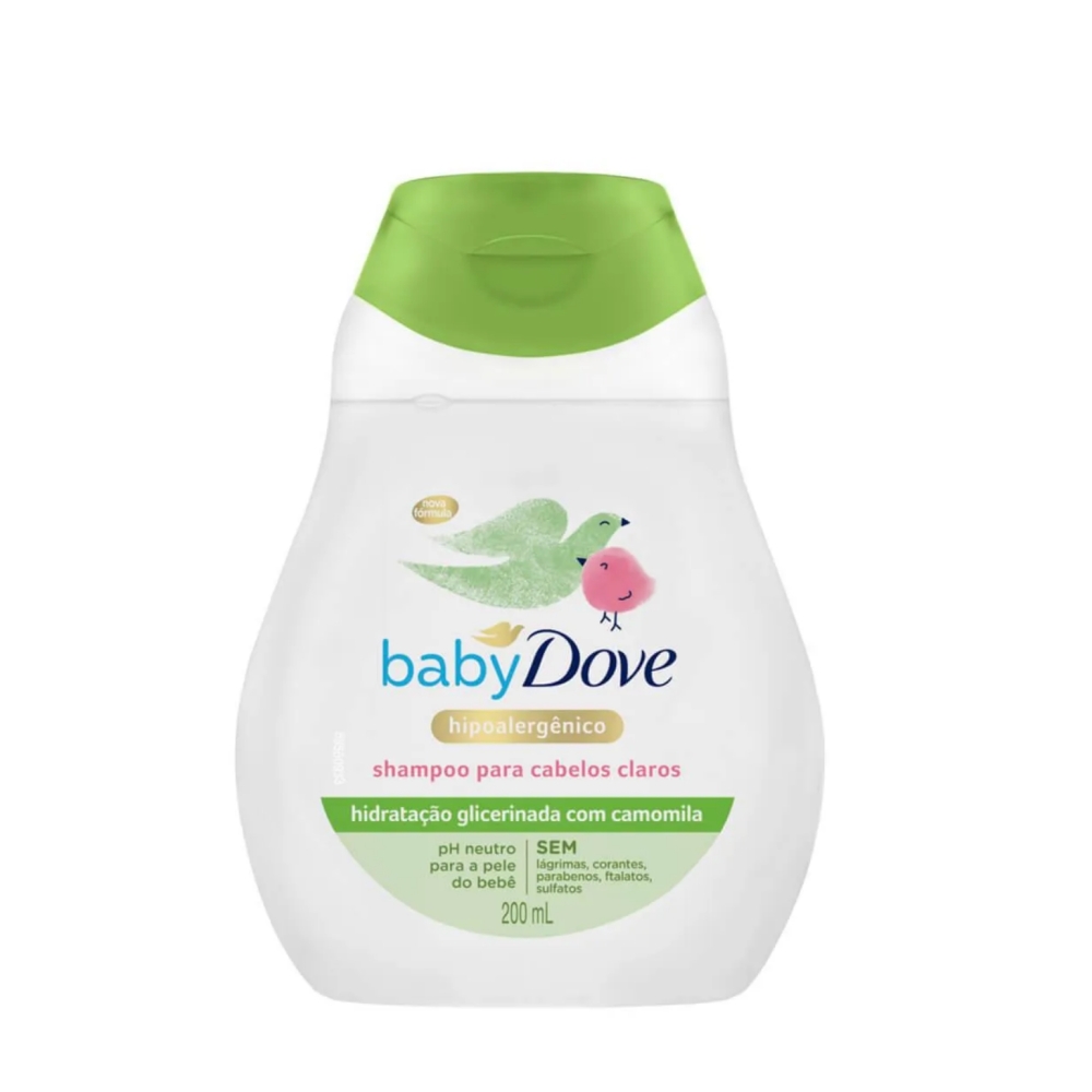 O que é o shampoo Baby Dove para cabelos claros? O shampoo Baby Dove para cabelos claros traz uma fórmula suave com camomila que mantém a hidratação e os nutrientes essenciais ao couro cabeludo. Com pH neutro para a pele do bebê, este é um produto hipoalergênico, ou seja, evita o surgimento de possíveis alergias. Além disso, ele é livre de corantes, parabenos, ftalatos e sulfatos. Por isso, é um shampoo sem lágrimas e mais suave, até mesmo para recém-nascidos.