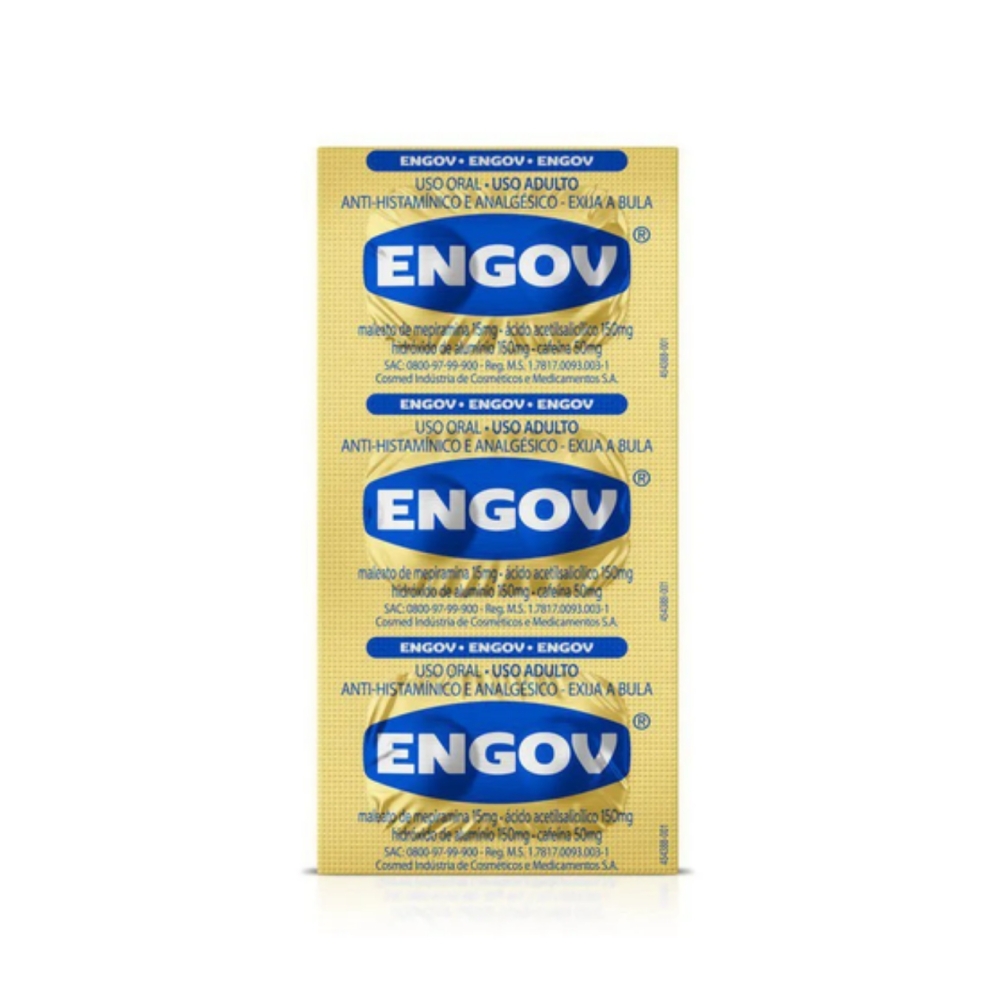Engov é um medicamento composto por maleato de mepiramina, hidróxido de alumínio, ácido acetilsalicílico e cafeína. Sua formulação combina efeitos analgésicos, anti-histamínicos, antiácidos e estimulantes. Ele auxilia no combate do mal-estar que você pode sentir após momentos de curtição, aliviando dores leves a moderadas, como dor de cabeça. Seu efeito anti-histamínico ajuda a reduzir a irritação nas mucosas, enquanto sua ação antiácida combate a azia e a sensação de náusea. Além disso, a cafeína potencializa o efeito analgésico, proporcionando uma recuperação mais rápida.