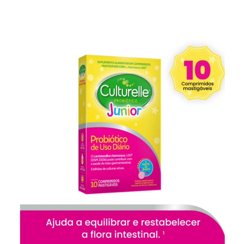 Descrição do produto O que é o Culturelle Probiótico Junior com 10 comprimidos? Culturelle é um probiótico recomendado por pediatras para a suplementação alimentar de crianças a partir dos 3 anos de idade. Ele contribui para o equilíbrio da microbiota intestinal, que é o conjunto de micro-organismos presentes no intestino, além de atuar diretamente no fortalecimento do sistema imunológico. Tudo isso com sabor de frutas vermelhas para facilitar a aceitação das crianças.