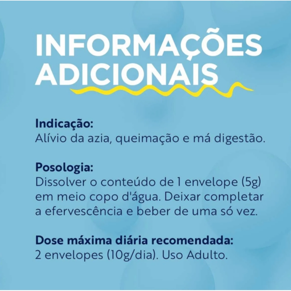 Modo de usar: Dissolver 1 (uma) colher de chá (5g) em meio copo de água. Deixar completar a efervescência e beber de uma só vez.