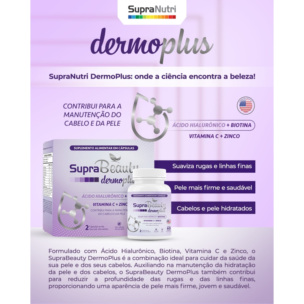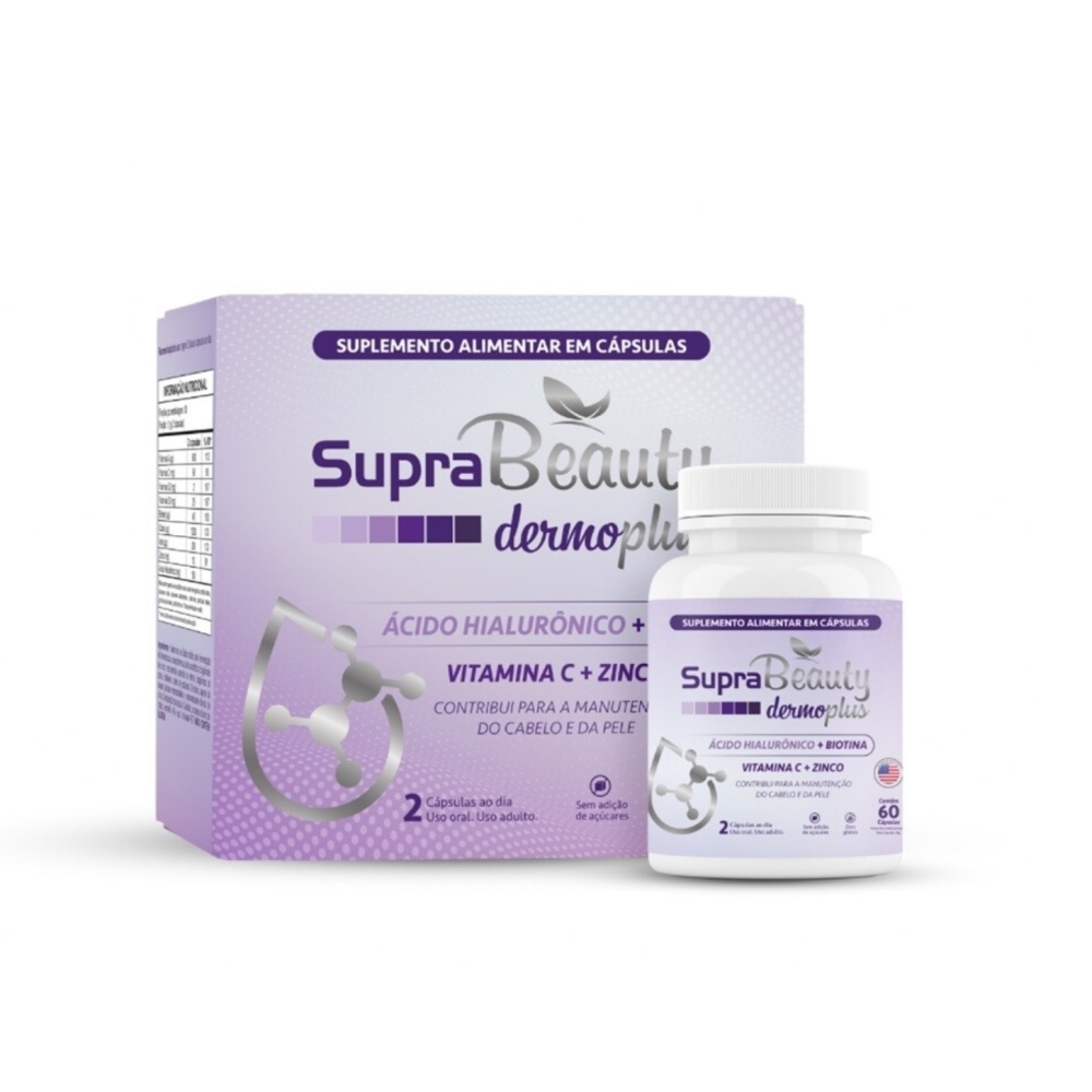 O que é e para que serve o Supra Beauty DermoPlus 60 Cápsulas? O SupraBeauty DermoPlus é uma revolução nos cuidados com a saúde da pele e cabelos, formulado com Ácido Hialurônico, Biotina, Vitamina C e Zinco. Sua combinação ideal contribui para a redução da profundidade das rugas e linhas finas, proporcionando uma pele mais firme, jovem e saudável. Além disso, sua fórmula hidrata intensivamente, auxiliando na retenção de umidade e proporcionando vitalidade e brilho aos cabelos, enquanto a pele se mantém suave e nutrida. Ao estimular a produção de colágeno e proteger contra danos oxidativos, o DermoPlus promove uma pele mais tonificada, resistente e radiante, suavizando rugas e linhas finas para um visual rejuvenescido.